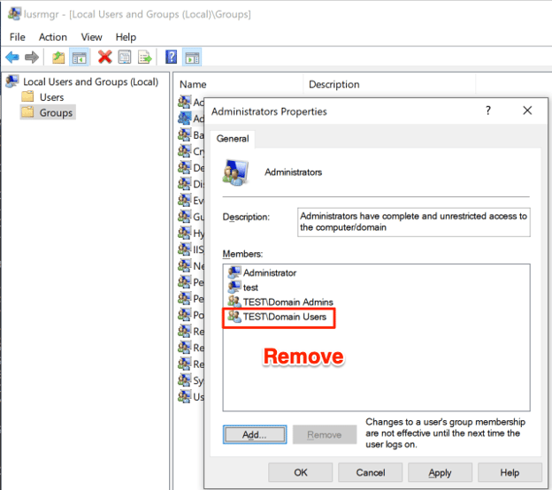 Once identified, this can be remedied by removing the “Domain Users” group from the computer’s “Local Administrators”: