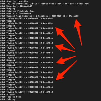 If you opted to connect the Proxmark3 to a computer, you should be seeing the Proxmark3 program attempt to emulate different card numbers. The screenshot below shows utilizing the Proxmark3 and initializing the ProxBrute mode.
