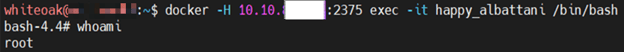 With the container now running, the docker exec command was used to directly interface with the operating system of the container. A root shell was provided due to the use of the –privileged flag when running the container: